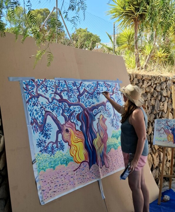 Above: Kirsty Wain next to ´Bahía Rocosa en Playa de los Toros´ (2023) 90x90 cm ~ Oil Painting