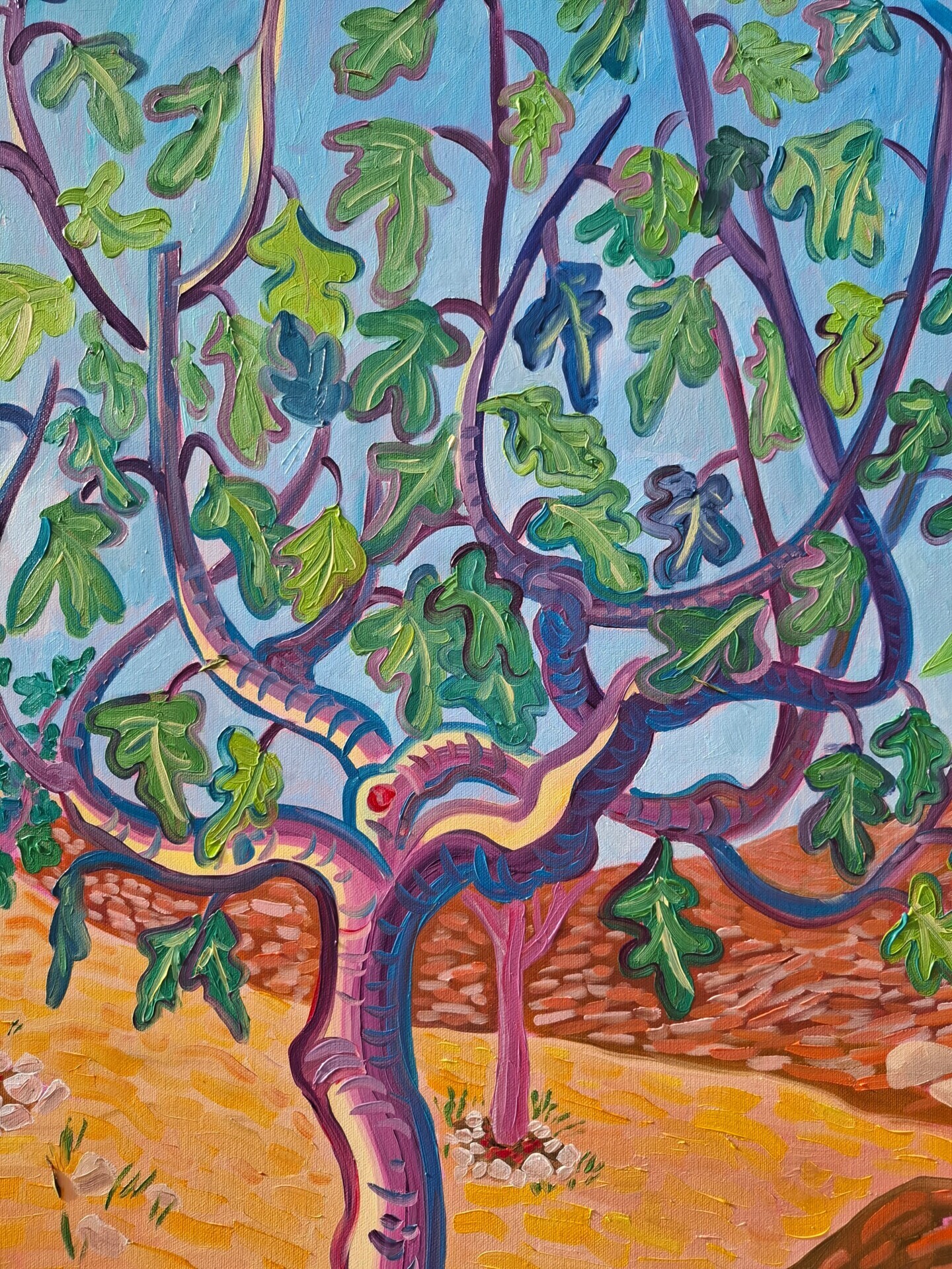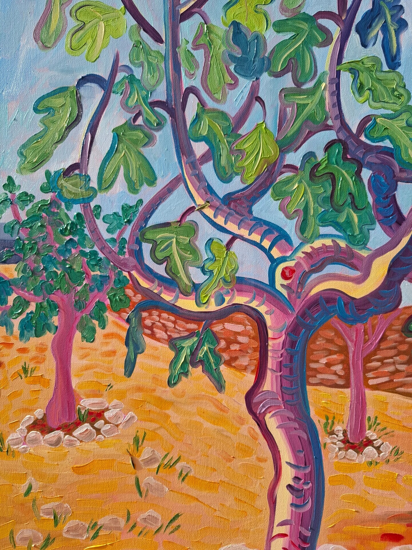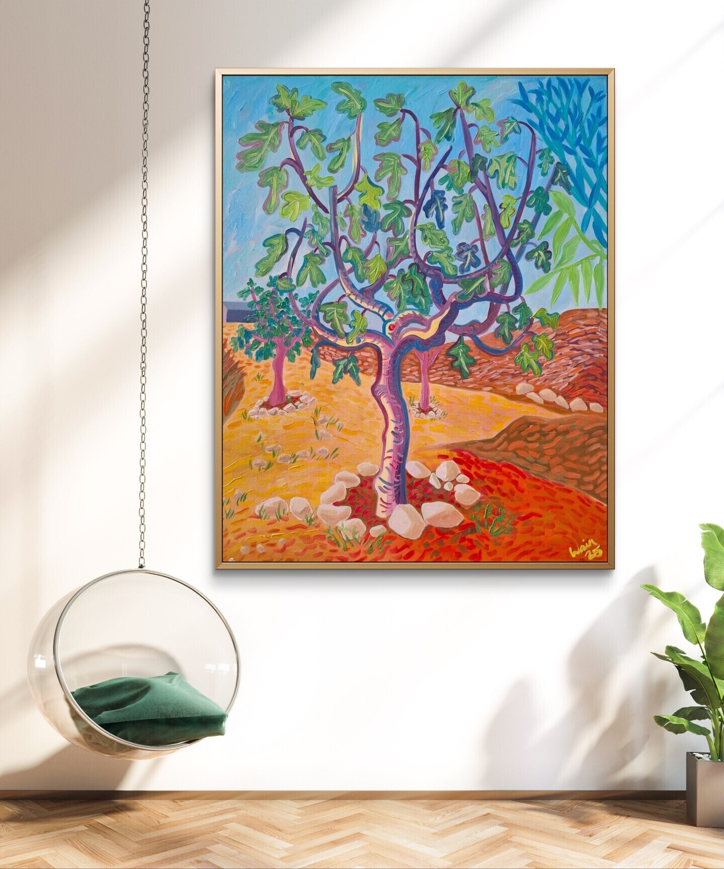 This piece features a fig tree in a Mediterranean-style setting, painted with Wain’s signature bold use of colour, dynamic brushwork, and rhythmic lines. The palette of warm ochres, deep purples, fresh greens, and bright blues evokes both the heat of the landscape and the lively energy of the tree itself.